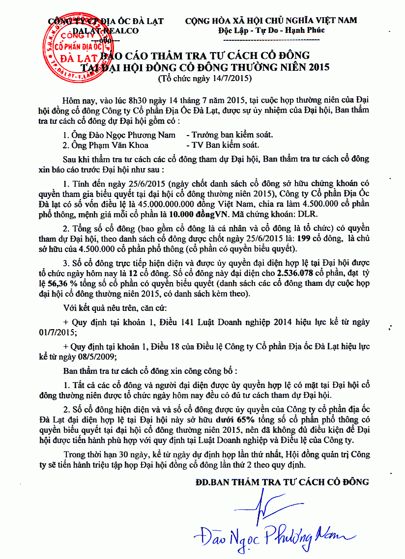 BÁO CÁO THẨM TRA TƯ CÁCH CỔ ĐÔNG TẠI ĐHĐCĐ THƯỜNG NIÊN 2015 (14/07/2015)