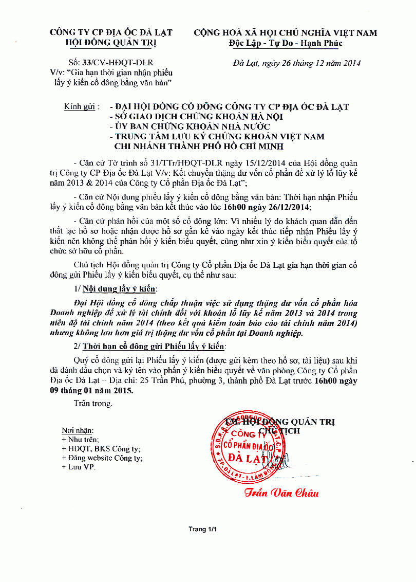 THÔNG BÁO GIA HẠN THỜI GIAN NHẬN PHIẾU LẤY Ý KIẾN CỔ ĐÔNG BẰNG VĂN BẢN (30/12/2014)